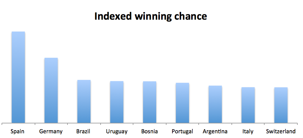 Interestingly, I could find Uruguay, Bosnia and Switzerland in the list of the top 10 teams with high winning chances; ahead of those of England, Belgium and France (remember, this is not the World Cup winning chance but just the winning probability in a game. The World Cup winning probability would be dependent on how the teams progress through the tournament. We will look into that in the next section). But these teams are the potential dark horses for this tournament. My bets are on Uruguay and Bosnia. – Suarez and Dzeko!
